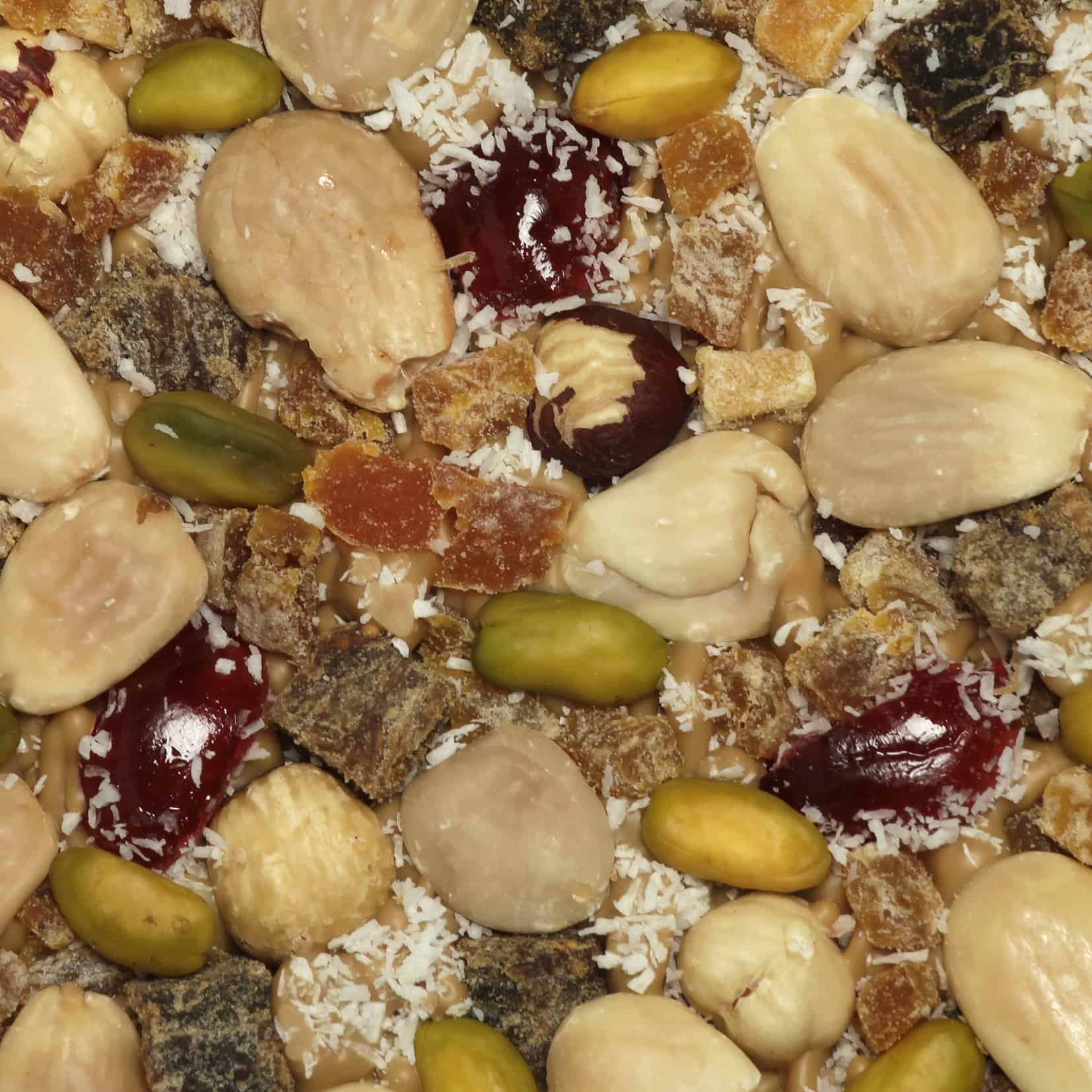 Ingrédients : chocolat blond 32 % de beurre de cacao minimum (beurre de cacao, sucre, lait écrémé, lactosérum, beurre, émulsifiant : lécithine de tournesol, extrait naturel de vanille), amandes, noisettes, pistaches, figues séchées (figues, farine de riz), abricots séchés (abricots, agent d’enrobage : farine de riz, conservateur E220 : sulfites), raisins blonds (raisins secs, huile de tournesol, conservateur E220 : anhydride sulfureux (sulfites)), noix de coco râpée.