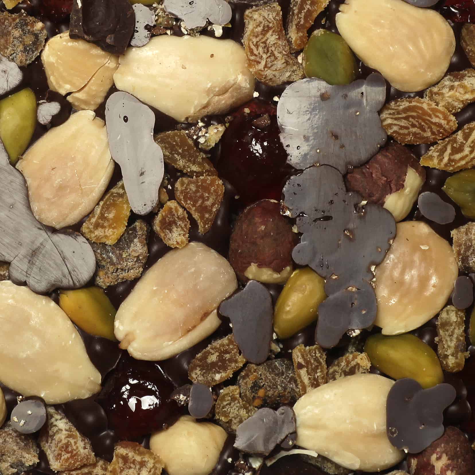 Ingrédients : chocolat noir 62 % de cacao minimum (fèves de cacao, sucre, beurre de cacao, émulsifiant : lécithine de tournesol, arôme de vanille), amandes, noix, noisettes, pistaches, bigarreaux confits (bigarreaux, sirop de glucose-fructose, concentré de fruit et légume (carotte et aronia), correcteur d’acidité E330), figues séchées (figues, farine de riz), abricots séchés (abricots, agent d’enrobage : farine de riz, conservateur E220 : sulfites).