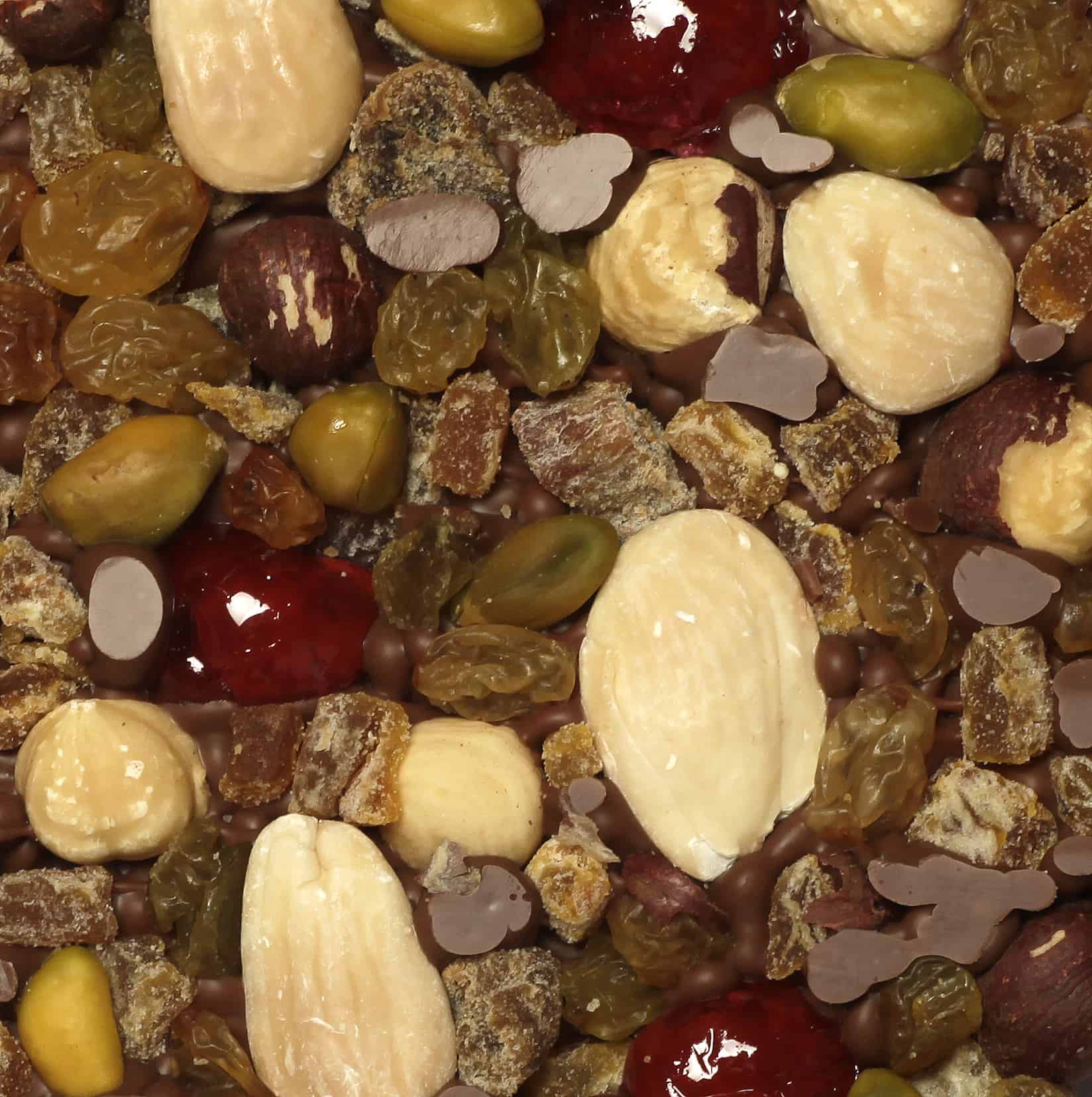 Ingrédients : chocolat lait 39 % de cacao minimum (sucre, beurre de cacao, lait entier en poudre, fèves de cacao, émulsifiant : lécithine de tournesol, extrait naturel de vanille), noix, noisettes, pistaches, bigarreaux confits ((bigarreaux, sirop de glucose-fructose, concentré de fruit et légume (carotte et aronia), correcteur d’acidité E330), figues séchées (figues, farine de riz), abricots séchés (abricots, agent d’enrobage : farine de riz, conservateur E220 : sulfites)