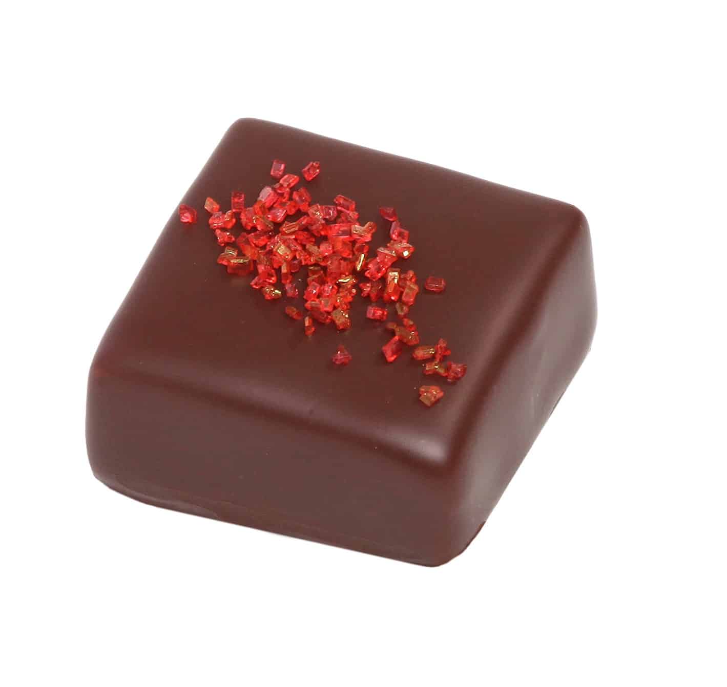 Intérieur : chocolat extra noir (fèves de cacao, sucre, émulsifiant : lécithine de tournesol), chocolat lait (sucre, beurre de cacao, lait entier en poudre, fèves de cacao, émulsifiant : lécithine de tournesol, extrait naturel de vanille), crème fraiche (lait), pâte de réglisse (sirop de glucose, extrait de réglisse, sucre, colorant E150b, arômes (contient celéri), beurre (lait), glucose (sirop de glucose, stabilisant : disulfite de sodium (sulfites)).